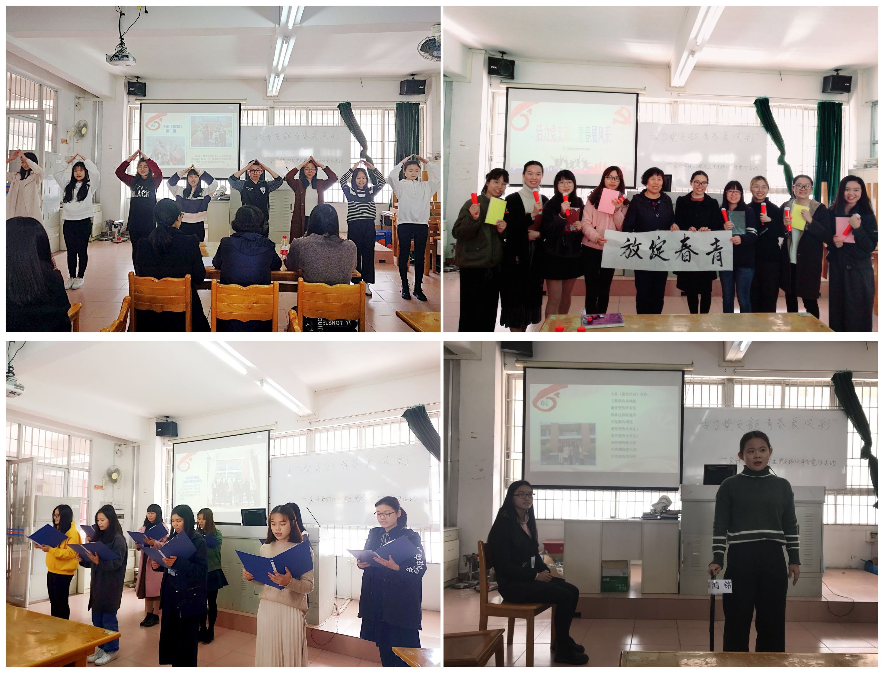 本次活动由支部党员赖敏清主持。支部党员们共分为四组,用不同的方式展示青年党员的爱国情怀。由党员王佩琪、叶秀美等人通过《建党伟业》经典片段演绎,分别扮演胡适、陈独秀、李大钊和辜鸿铭等人角色,重演北大师生间关于新旧文化之间的激烈辩论,表演深刻到位,发人深省;由邓瑜、杨利锋等人带来的手语表演《国家》,从歌词中感受祖国的魅力,用手语表达党员对祖国的热爱,共同传递心中对祖国的澎湃之情;由梁洁莹、吴娃娃等人用朗诵的形式《献给党的青春颂》歌颂党的丰功伟绩,字里行间,嘹亮的声音,无不体现党员们对党的拥护,由李伟成、陈嘉敏等人用歌唱《我相信》,用青春洋溢的方式向大家展现青年学生的热情,体现了青年党员自信有担当,相信自己可以为国家发挥绵薄之力。