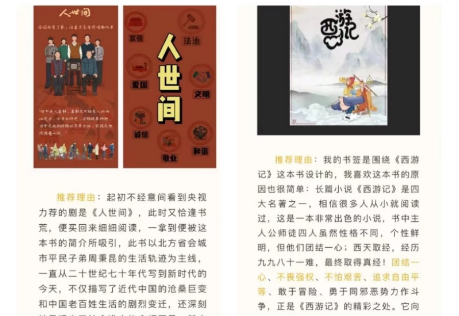 本次活动采取从阅读中获取灵感设计书签的方式鼓励广大学子以新形式进行书籍分享,感受阅读魅力。截至9月20日共收到112份作品,推荐书目类型涵盖古今中外,每位参与者都认真精读书籍,以不同的思维角度解读书中主题与内涵,精心搭配色彩与元素,创作出一份份思想性与艺术性兼具的书签作品。他们用心向读者们推荐所阅书目,并结合自身实际各“书”己见,字里行间饱含真挚的情感,启迪读者们阅读是人类获取知识、启智增慧、培养道德的重要途径,引领大家通过阅读启发思想,树立崇高理想,涵养浩然之气。