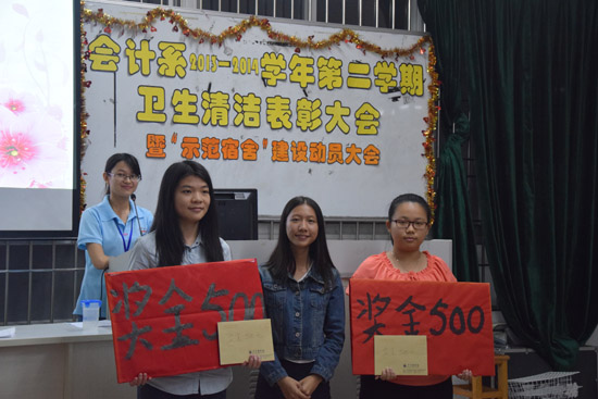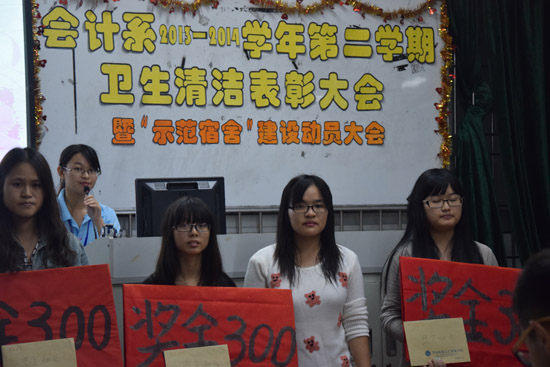 经过一年来大家的共同努力,会计系在卫生清洁方面取得了优异成绩。为了进一步美化我系的文明卫生,创建文明和谐的校园环境,11月30日晚上7点30分在教学楼A305举行了会计系2013-2014学年第二学期卫生清洁表彰大会暨“示范宿舍”建设大会。出席本次大会的嘉宾有会计系学生会主席甘远锌,副主席卢洁莹、何元钰,秘书长池跃莉,纪检部部长谭凤明,保卫部部长江泓,以及13级级委。生活部部长谭敏英担任本次大会主持人。