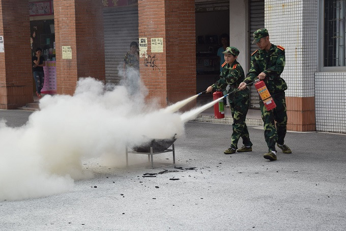 本次活动作为新生军训教育的“重头戏”,以演练的形式进行。主要内容有现场火灾逃生演习和灭火演练。在警报声响起之后,模拟烟雾之中,工作人员组织学生有序地撤离,“掩住口鼻、弯腰前行、有序、小跑”,一句句坚定有力的口令,指导着学生撤离。短短2分钟,3栋新生全部安全撤离。第二个项目是演习使用灭火器。由消防队队长讲解灭火器的使用方法及注意事项,新生组织成一支队伍模仿使用灭火器。新生按照队长讲解的灭火器使用方法,右手提着灭火器到现场,除掉铅封,拔掉保险销,左手握着喷管,右手提着压把,在距离火焰两米的地方,右手用力压下压把,左手拿着喷管左右摆动,喷射干粉覆盖整个燃烧区。最后,全体学生站队,清点人数,汇报情况,整个消防演习过程井井有条。
