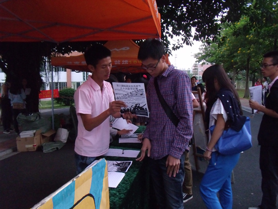 为更好地开展第八届校园文化艺术节之“音乐点亮青春,歌声传递梦想”校园十大歌手比赛的各项工作,宣传有关本次比赛的各项信息,提高活动的影响力。从10月29日上午11点开始,会计系团委学生会干部干事们在面包铺对面开展了为期三天的摆摊宣传活动。