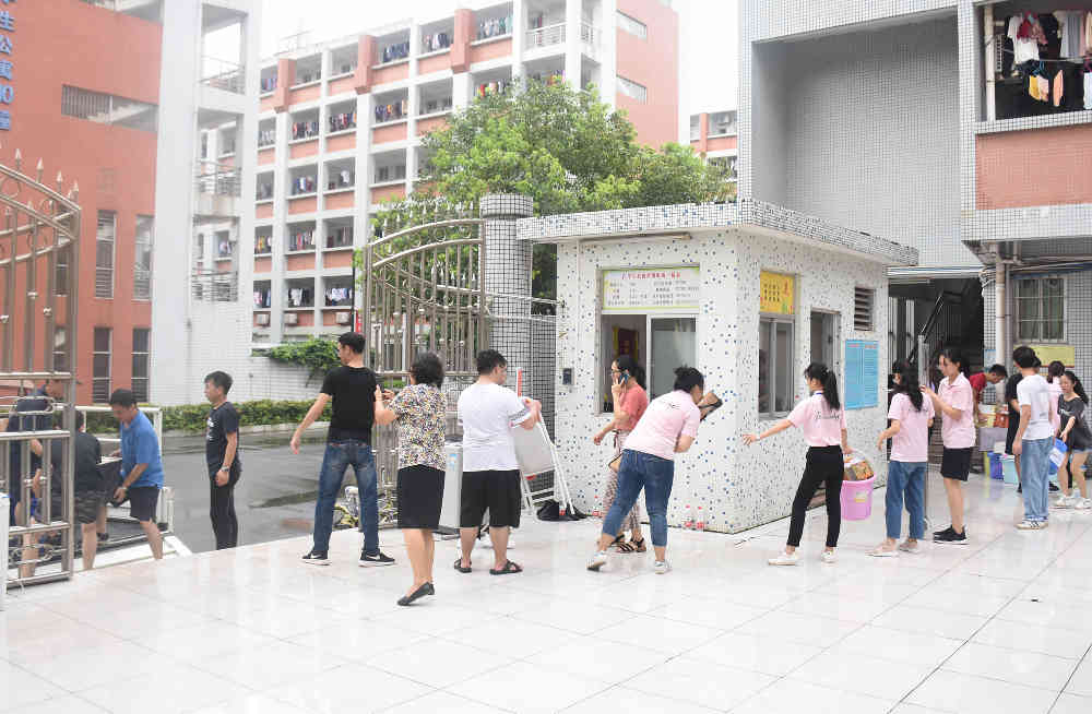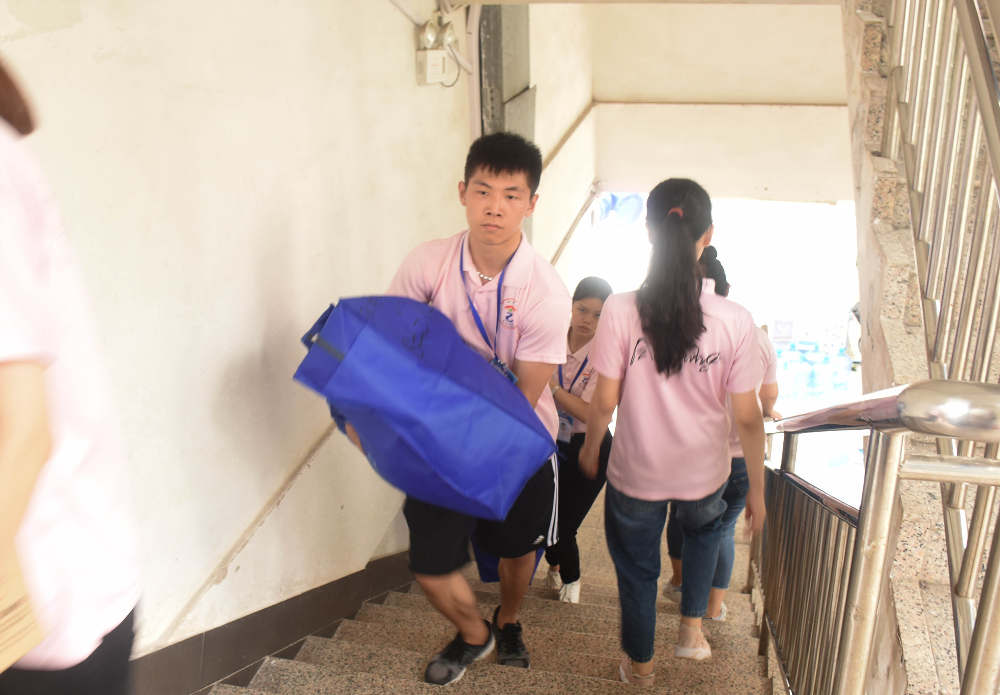在开始搬宿舍之前,学生公寓前便早已聚集几十名志愿者,在各老师对志愿者的简单分配任务后,紧张的搬迁工作开始了,有的负责指挥,有的负责装卸,有的负责派水。参与运输的两辆车在8栋与30栋之间装、卸学生的行李。虽然在搬运的过程中突然下起大雨,但大家仍然井然有序,无所畏惧,照样冒着大雨毫无顾忌地去搬运行李,半刻也不松懈。