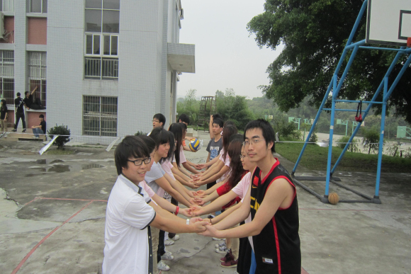 四大球类比赛过程中,排球长球讲究的是速度与团队的合作,看似简单的排球传球,却需要运动员之间的技巧配合,激烈的速度碰撞,摩擦出一次又一次的火花。毽球接力要求运动员之间的互相配合,参赛运动员的每一次传跳都牵动着场下观众的心。平衡乒乓球的项目上留下了许多在球场奔跑的身影,运动员的的相互协助,每一次传送乒乓球都是一种速度的比拼,运动员们就像箭一样,向目标飞去。最为吸引且具有挑战性的是投篮之星篮球定点投篮,手里紧握的篮球,那篮球上凝集了全班的希望,每一次的进球都赢来了场下的掌声与欢呼声。最激动人心且澎湃激情的是长龙传球的项目,每支参赛队伍都着装统一的排列在篮球场上,当裁判的哨子一落,比赛开始了,运动员们手拉手拼成一座长桥,球通过手臂往下滚动,队员循环排队让球依然在队员手中。在这里,我们看到的是团结有序,我们看到的是群策群力,我们看到的是相互合作。