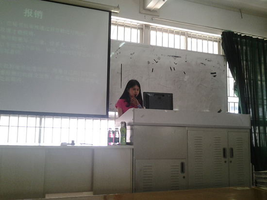 副秘书长周钰首先为大家介绍了有关报销、通讯稿及其相关工作。先以PPT形式介绍了学生会报销经费的大致流程,并以模板为大家讲解了制作电子凭证需要注意的事项。其后介绍了通讯稿的格式和要求。最后公布了各部门的挂职秘书,并简单介绍了挂职秘书的职责。副秘书长魏缅则介绍了制作计划总结的格式,并总结了各部门10月计划总结的错误,同时希望各部门能认真严谨对待总结计划,尽量避免格式错误。而后与各部长说明了借用物资的程序。大会最后,秘书长池跃莉对大会作了总结和补充说明。报销经费方面,各部门要积极收集发票。关于活动预算,池跃莉则表示各部门在做预算之前要考虑学生会经费,预算要合乎实际。同时希望各部长要准时收集资料,配合秘书处工作。