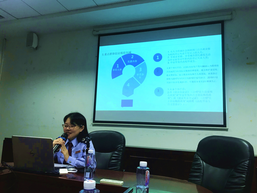宣讲前,副局长侯嵬做了讲话,他提到现在国家对大学生创新创业有较大的支持力度,鼓励有创业意识的同学要多了解多学习,对初创期的大学生有一定的帮助,也提到会计学子无论是否创业,应多关注税收政策,掌握相关的实务知识,丰富自己的专业知识。随后容梦丹对创业税收优惠政策进行宣讲,她深入浅出地为同学们讲解了创业初期和创业成长期的优惠政策,主要涵盖了增值税起征点的优惠内容、小型微利企业的优惠内容、科研机构优惠政策等同学们关注的税收热点问题。宣讲会上,同学们也结合个人情况向税务局干部提出疑问并得到解答。