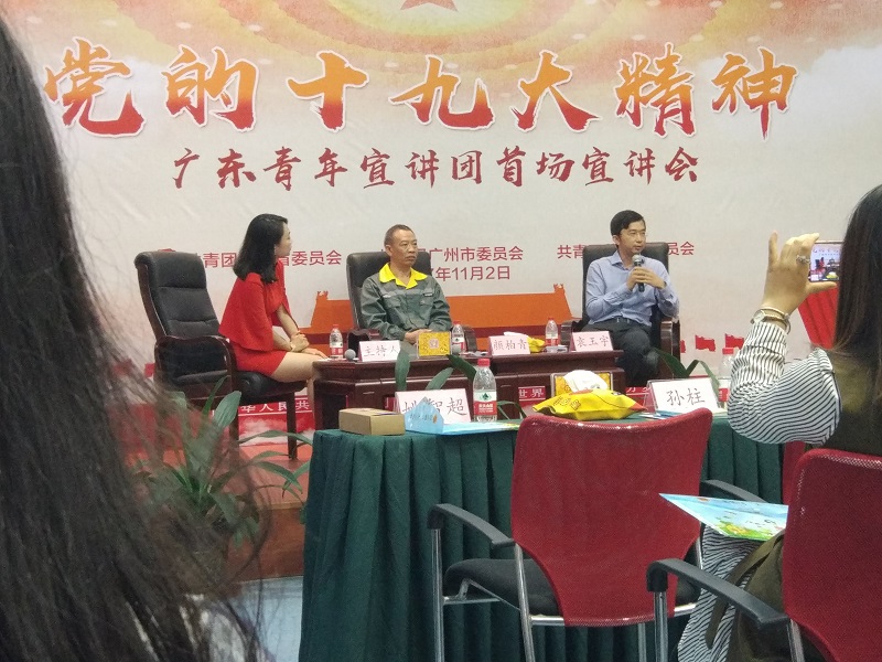 宣讲会一开始,主持人一一介绍了到场的来宾,共青团广东省委书记迟志雄为活动致辞。省委书记在讲话中特别强调了十九大召开的重要历史意义,当前我国正处在全面建成小康社会决胜阶段、中国特色社会主义进入新时代的关键时期,当代青年作为建设中国特色社会主义的接班人,要义不容辞地承担责任、履行义务,为国家繁荣富强贡献自己的力量。随后,十九大代表颜柏青和优秀青年代表袁玉宇各自分享了自己的心得感悟。颜柏青除了十九大代表这一身份,他还是一位24年默默坚守在环卫行业的一名普通环卫工人。颜柏青分享最多的词汇,就是坚持与不忘初心,他曾是一名课任老师,他认为工作无高低贵贱之分,只要坚持下来,努力做好,在平凡的岗位也能实现自己的价值。优秀青年代表袁玉宇,从创业者和普通青年这两个不同的角色来告诉在座的青年学生,一定要有理想、有担当,要懂得抓住机遇,将个人理想与国家理想结合起来。宣讲活动过程中,参会嘉宾与在场青年进行了热烈的互动,气氛活跃,台下时不时响起热烈的掌声。
