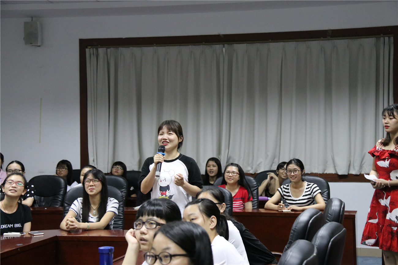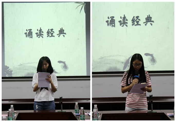 活动邀请了17级两名新生用普通话和在座的同学们分享她们阅读《论语》后的心得。审计1班的林兰儿谈到她在论语中悟到:“见贤思齐焉,见不贤而内自省也”是在教育自己要注重提升,不断地修身养德,不耻下问;“知之为知之,不知为不知,是知也”教会她,诚实是对自己的一种责任……财管3班王晓璇则从《论语》中懂得与他人相交的信义,更让她学会如何爱父母。 通过经典书籍的传诵,使得爱好阅读的同学们多了一分交流,更加全面领会中华传统文化的优秀精髓。邀请了曾担任学院大型活动主持人的学生龚锦盈、颜乔,和同学们分享普通话的的学习和练习方法,分享时还设置了“看图说话”互动,现场纠正一些常用文字的错误读音,也通过普通话绕口令小游戏,鼓励同学们学习普通话从开口练习做起。