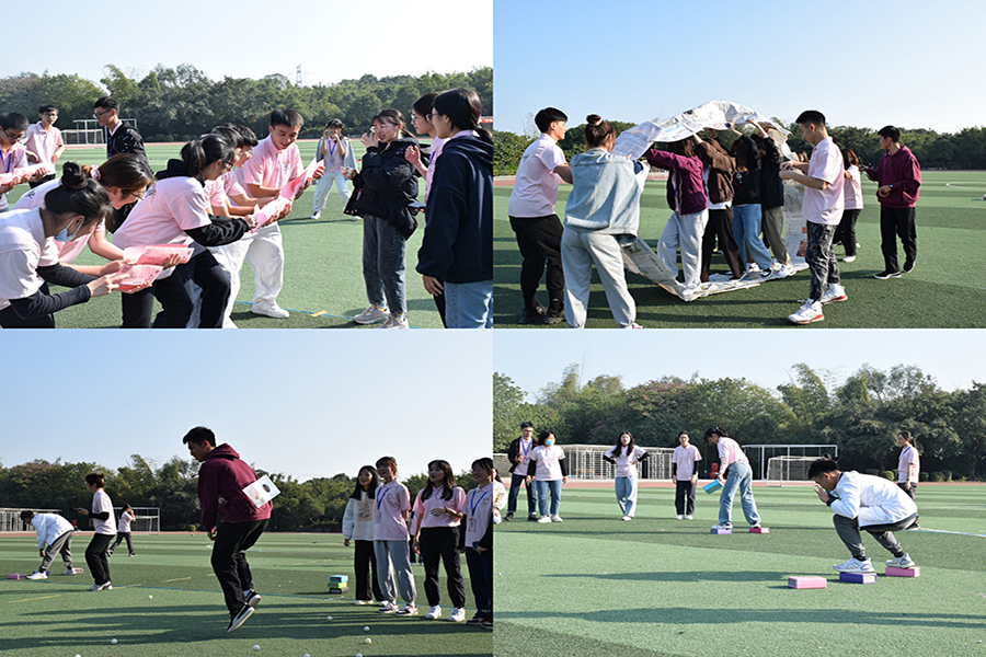 游戏环节由珠行万里、链接加速、疯狂接力、无敌风火轮四个游戏组成。游戏一是珠行万里,考验的是团队间的合作精神,充分体现了团队的领导力与沟通协调能力,每名队员必须把控好纸张的弧度与倾斜程度,以保证乒乓球能顺利到达终点;游戏二是链接加速,考验的是团队间的默契度,培养队员们的团结协作精神,每名队员迈步的大小与快慢,都会影响到整个队伍;游戏三是疯狂接力,它是由三明治、指压板跳绳、摸石过河、臀部抖球和足球射门五个游戏组成,它体现的是每名队员的责任感与分工能力,每名队员完成每个项目的快慢都关乎到整个队伍的成绩;游戏四是无敌风火轮,这也是最振奋人心的游戏,它是集队员们的动手能力与团队合作能力于一身的游戏,从制作到结束,都是一个循序渐进,互相配合的过程,增强了队员间的信任度,提升团队成员之间的凝聚力。