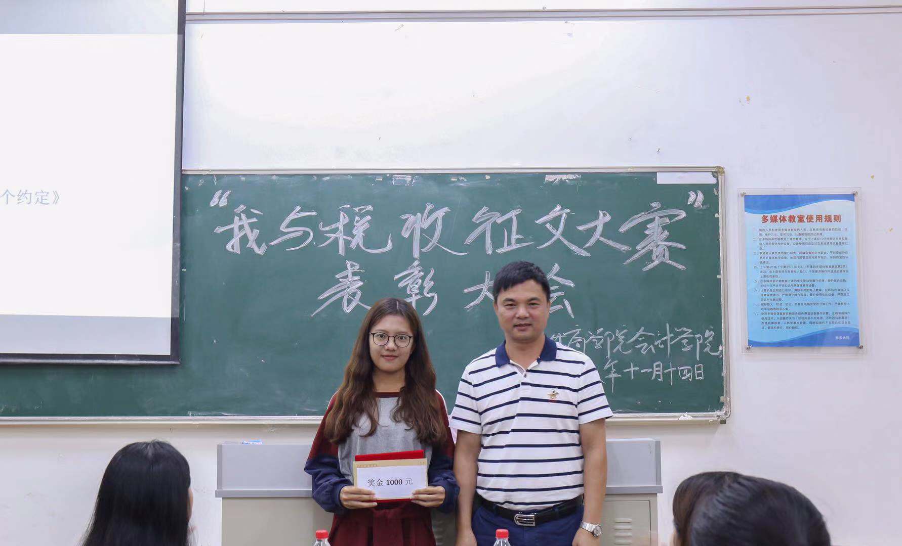 颁奖仪式结束后,由获得一等奖的林铄姿同学上台发表获奖感言。她表示,参加这次活动感到非常有意义。通过参加这次征文活动,让自己更加深入地了解自己所学的专业,更加清醒地明白“无税不国,国税强国,依法纳税,纳税光荣”的金色信念,纳税是我们每个人应尽的义务,税收也是我们建设美好家园的资本,也希望同学们能够积极参加类似的活动来充实自己。