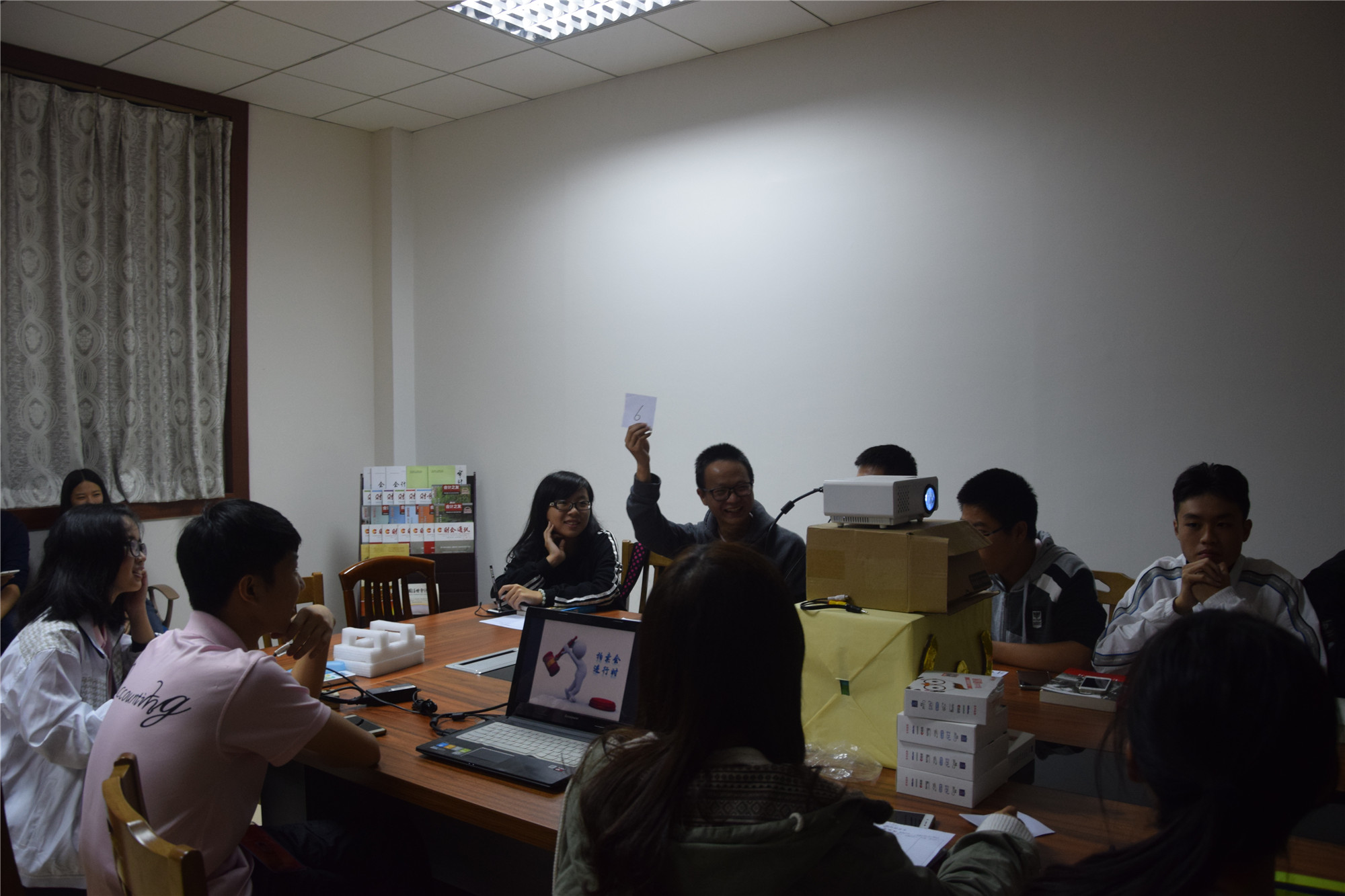 拍卖会现场,分享者带来了各种书籍,有课外阅读读物也有专业职称考试书籍。主持人首先介绍“拍卖规则”。紧接着,分享者纷纷向同学推荐自己手上的书籍,谈自己的读书感悟,吸引更多同学竞买他们的书籍,其他同学看到心仪的书籍,开始进行竞拍,亮出了一个又一个的高积分,喜悦欢快的气氛蔓延着整个现场。经过激烈的“拍卖”,同学们借换到自己心悦的书籍,并又尝试在积分卡上用会计专业的记账方式登记自己手中的《积分卡》。他们既在交流中享受读书分享的快乐,又在分享中感受志同道合者的温暖,通过轻松活跃的形式以书会友,共同构建书香校园。