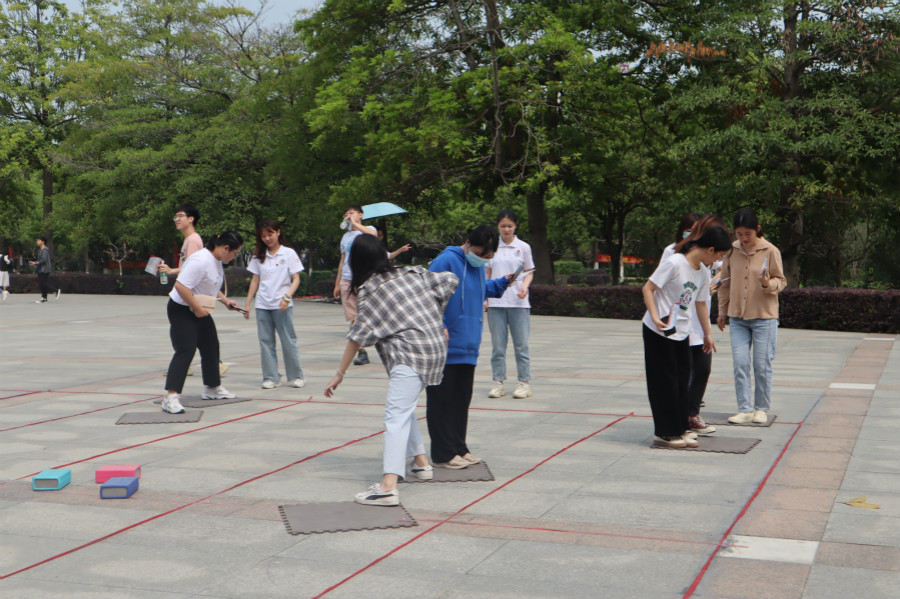 在10个关卡点中,还分别在排球场、小东湖、校友驿站、图书馆设置了相关的游戏环节。小东湖关卡点通过利用KT板让参赛者拍视频“说心语”,表达出对建党一百周年的祝贺以及作为广商学子积极迎评的心态,展示了广商学子的风采;参赛者在校友驿站处,通过抽题目,你说我猜的形式,把评估知识融入到游戏中,寓教于乐的方式在潜移默化中加深了同学们对评估知识的了解;图书馆关卡点则划分了四条队伍、四块区域,同学们利用瑜伽砖,一步步走过该区域,形象地展现了长征路上“过草地”的画面;排球场终点处,同学们在长征版图上插上小红旗,拍照发朋友圈集赞,顺利在“会宁”会师。四个小游戏,吸引了同学们积极参与到本次活动中,让同学们在乐中学,在乐中做,全身心参与其中。