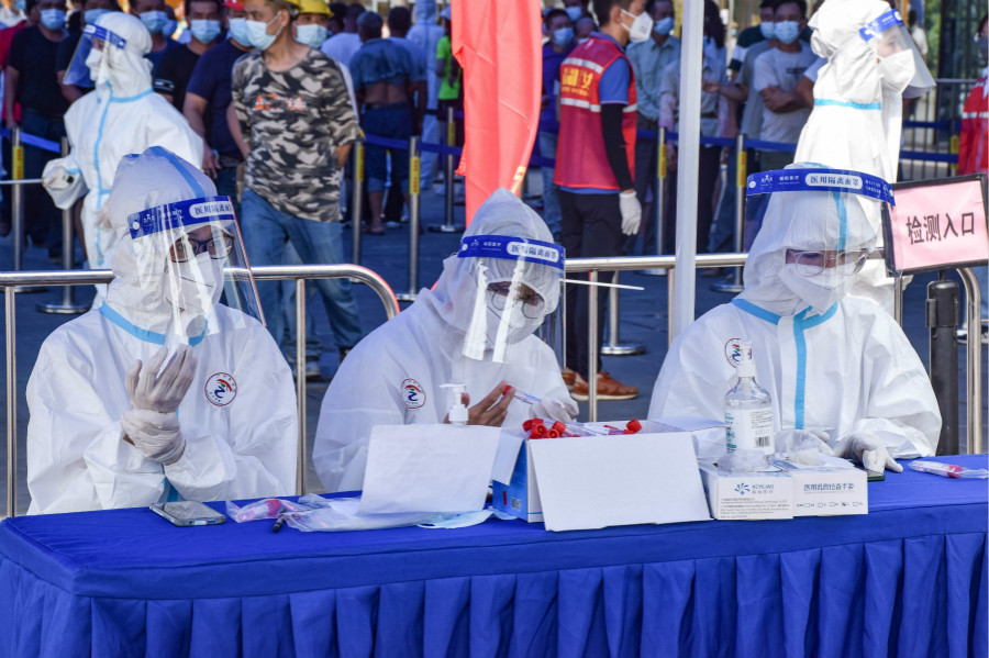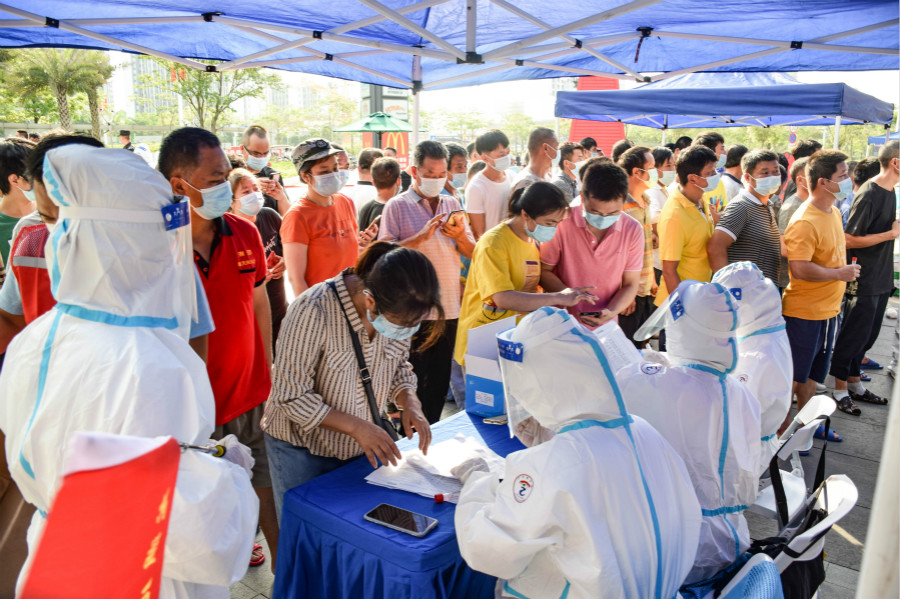 正午,气温高达33摄氏度,炎炎夏日,身着密不透风防护服的志愿者们依旧顶着烈日,坚守在各自的服务岗位上。在筛查采样点的等候区,志愿者们耐心指引社区居民通过粤核酸小程序进行信息登记,同时核验健康码和进行测温工作,在确保社区居民安全的情况下予以通行。负责指引核酸检测流程的志愿者们也有条不紊地协助医护人员工作,确保核酸检测工作高效运作。