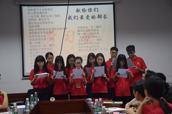 经验总结会上,一段精心制作的视频带着全场人员回顾了2015-2016学年学习会的工作历程,展现了分会这一学年举办的特色活动,特别是创新课堂微党课开展和建党95周年活动的设计,都是这一年满满的成就,也看到了干部为之辛勤付出的身影。随后各部门干部、学习班班长代表进行工作总结和经验分享,为学习会干部间交流、成长提供一个平台。干部们还精心准备了节目——手语表演《光荣》、改编歌曲《献给你们——我们最爱的部长》,别具一格的感恩卡片,融入了干部间浓浓的友谊。